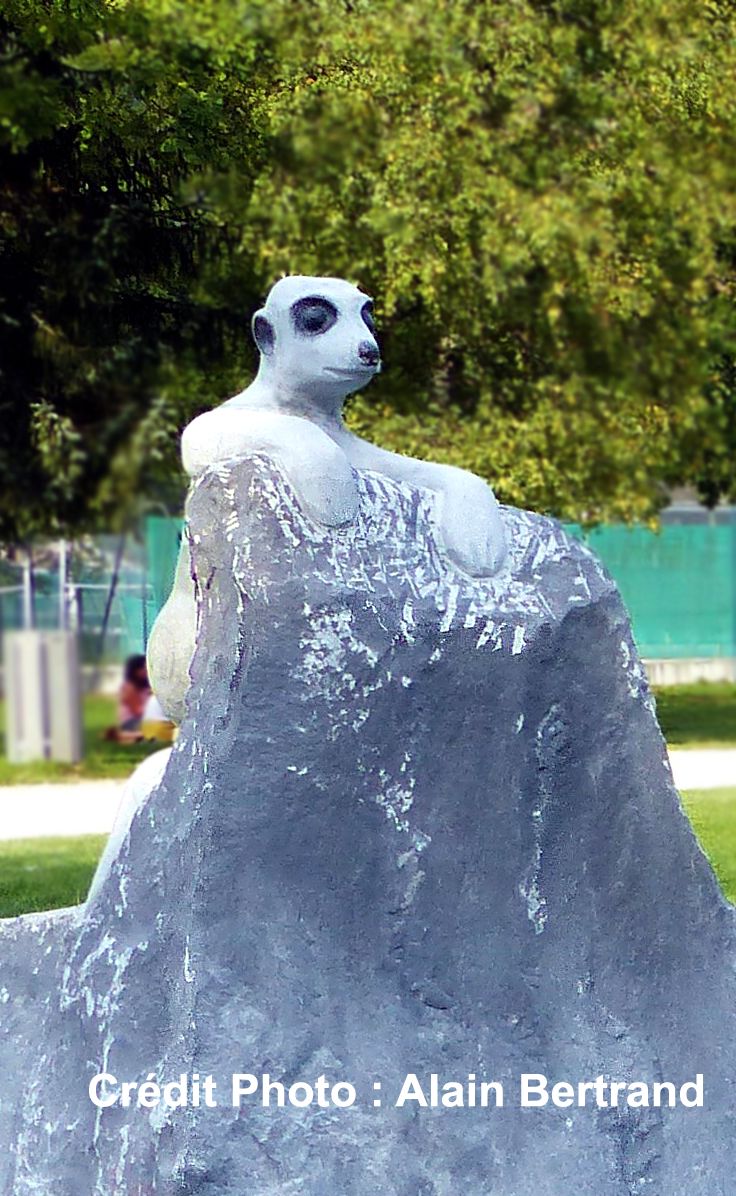 Cette année, le thème était « Solidarité » et comme en 2012, j’ai conçu un autre amoncellement animal, un suricate perché sur un chat, cette fois-ci dans la pierre locale marbrière « Bleue Noire des Alpes » ou pierre des Tines. Sur ma maquette, le chat était étendu de tout son long. Dans la « patate » (pierre irrégulière) qui m’a été attribuée, il ne contenait pas… Il s’est alors roulé en boule pour rentrer dans l’espace imparti. Un autre bel exemple criant de solidarité !